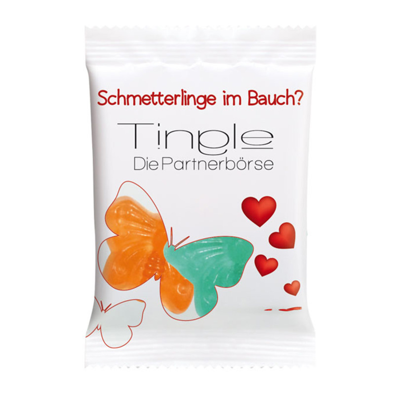 Fruchtgummi Schmetterlinge im Werbeflowpackab 15 Arb.-Tg.