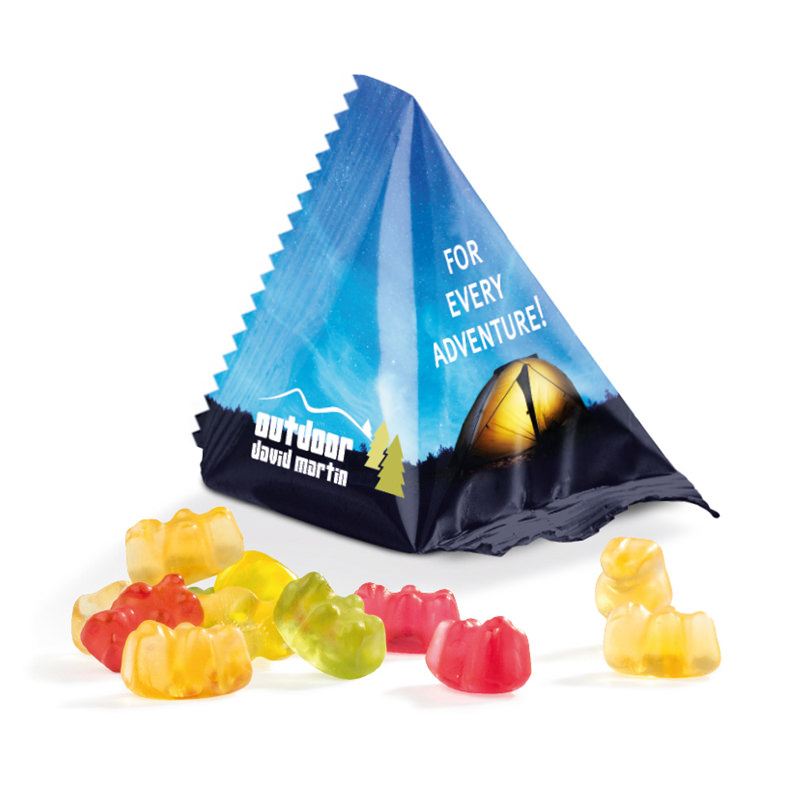Fruchtgummi Pyramiden im Werbeflowpackab 15 Arb.-Tg.