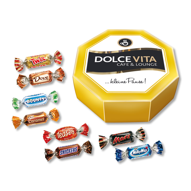 8-Eck Geschenkbox Kinnerton Pralinés mit Werbedruckab 15 Arb.-Tg. -