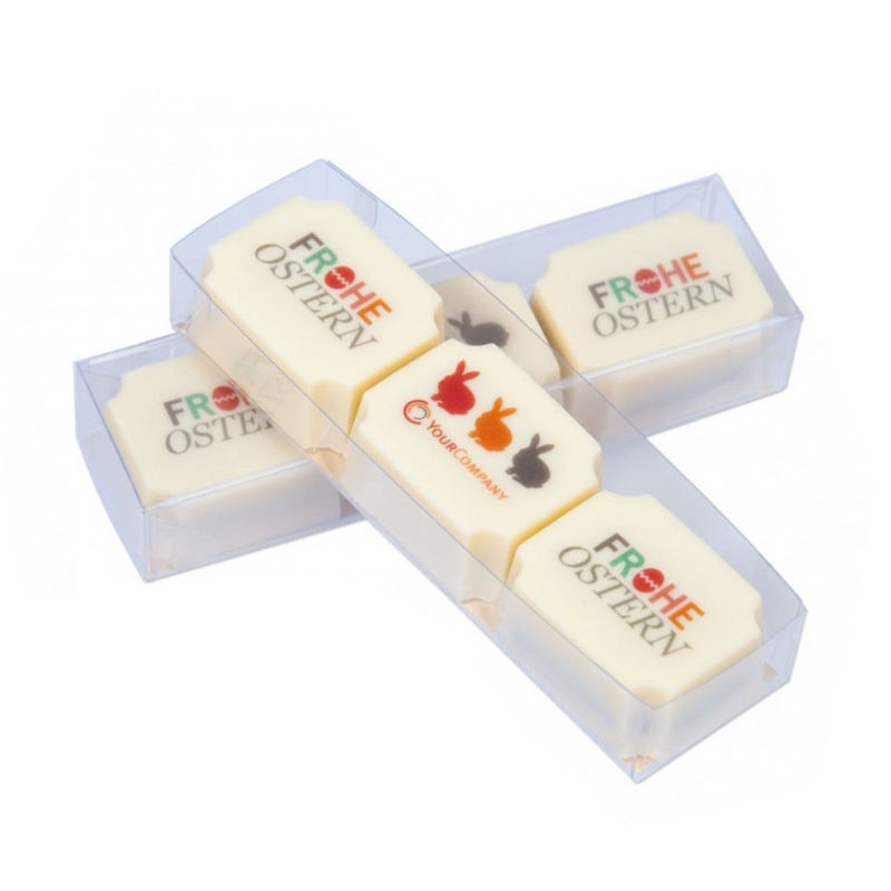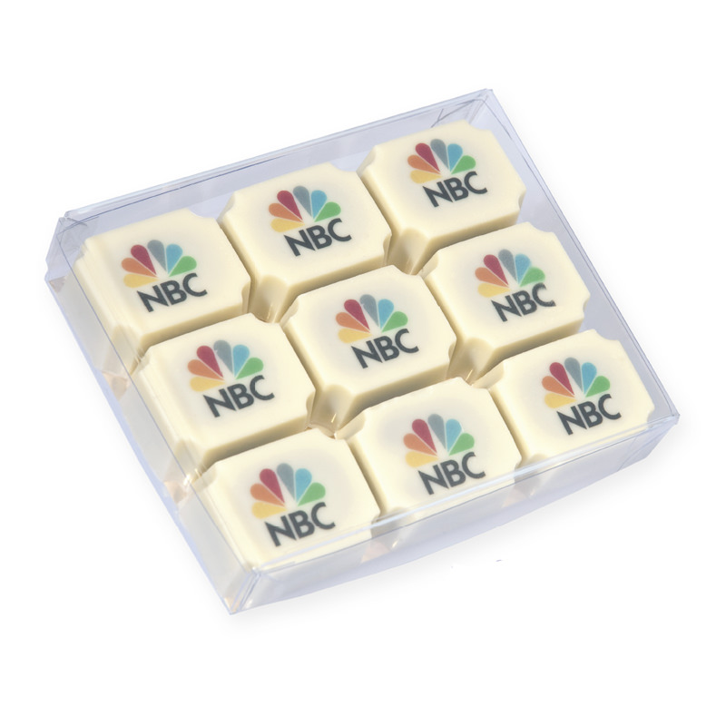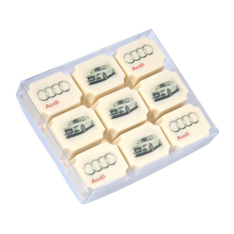 9 Bedruckte Pralinen in Klarsichtboxab 10 Arb.-Tg. -