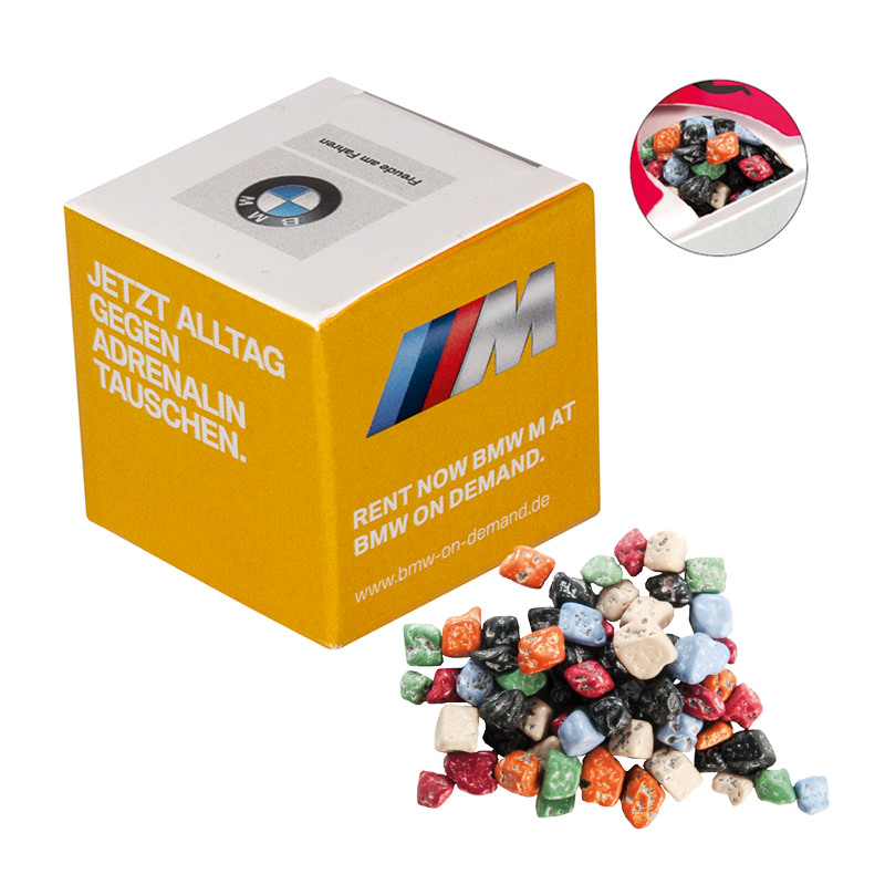 Werbewürfel mit buntem Schoko-Splitt und Logodruckab 15 Arb.-Tg. -