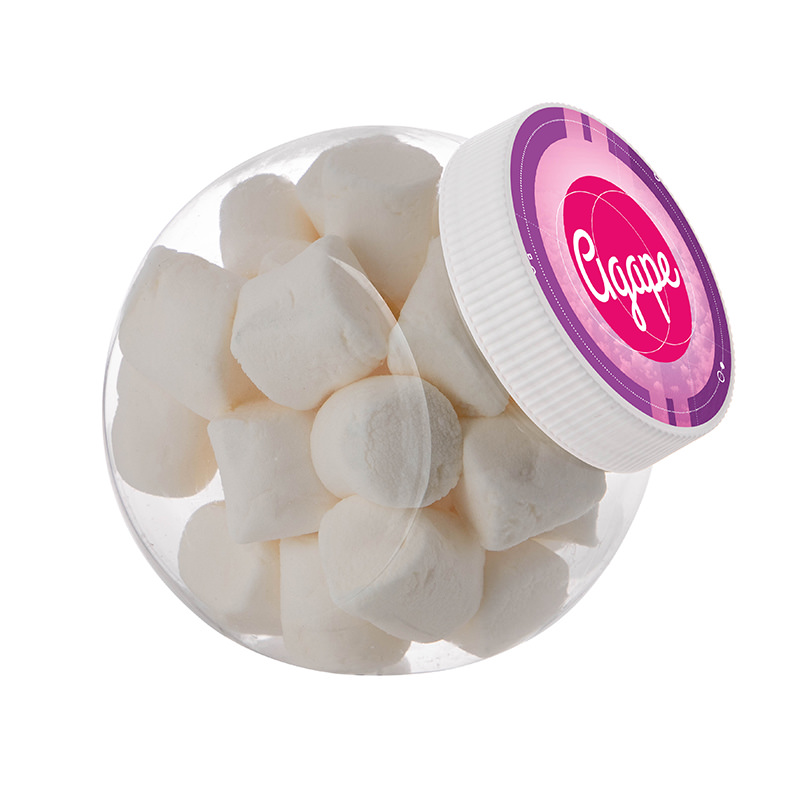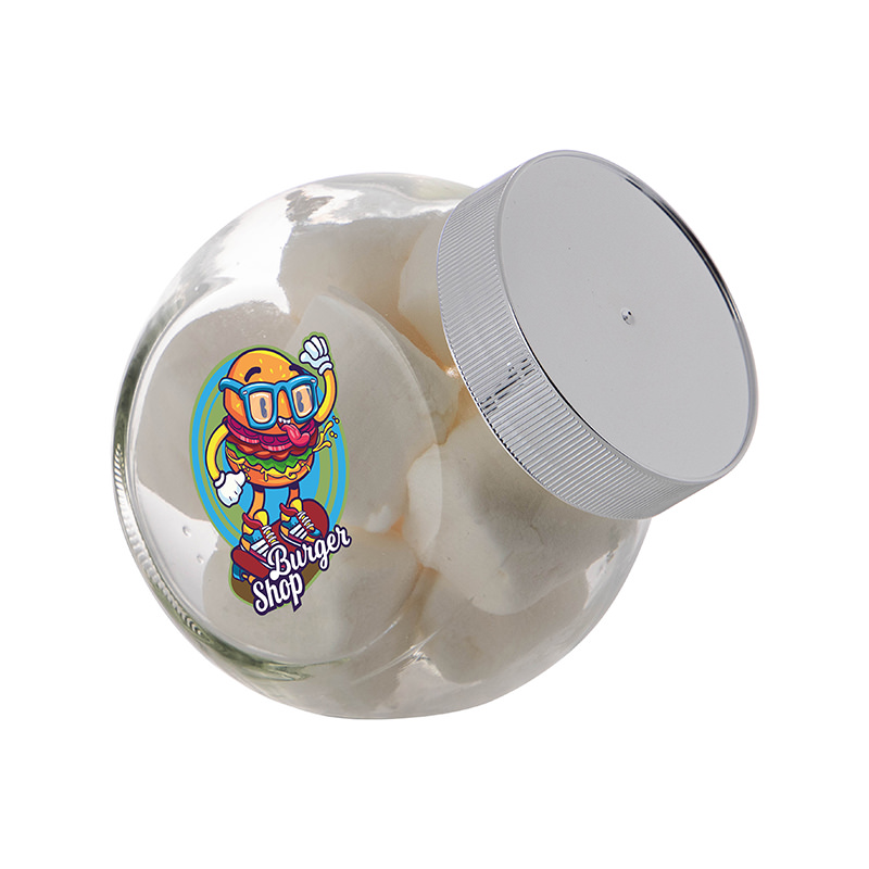 1 Liter Schräghalsglas befüllt mit Marshmallows und mit Werbeetikettab 10 Arb.-Tg. | ab 50 -