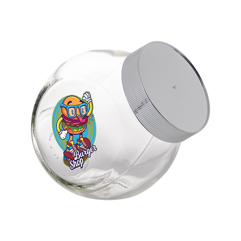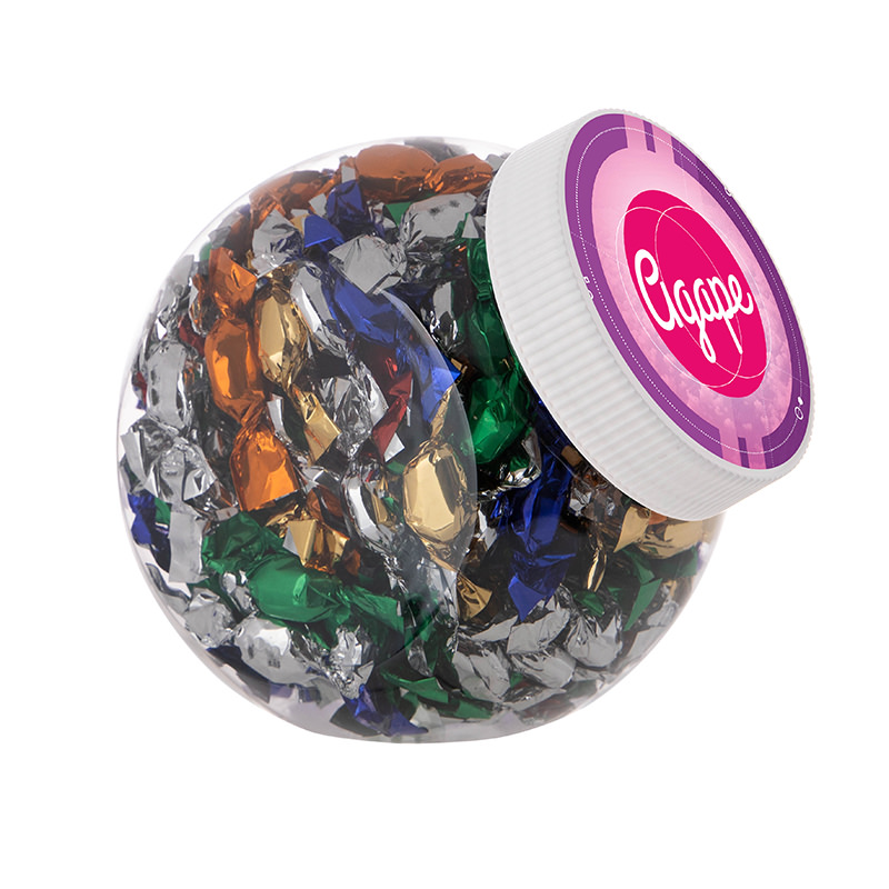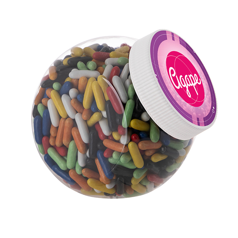 1 Liter Schräghalsglas befüllt mit Metallic Sweets und mit Werbeetikettab 10 Arb.-Tg. | ab 50 -