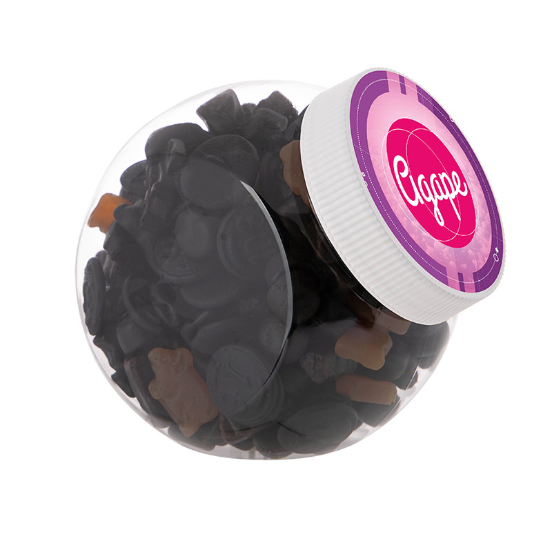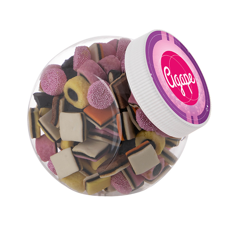 1 Liter Schräghalsglas befüllt mit Gemischter Lakritze und mit Werbeetikettab 10 Arb.-Tg. | ab 50 -