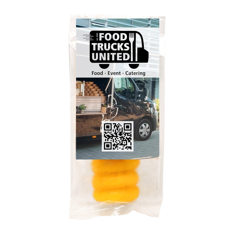25 g Schaumzucker Herzen im transparenten Standbeutel mit beidseitig bedruckbarem Werbereiterab 2,19 € | ab 10 Arb.-Tg. | ab 100 Stk. -