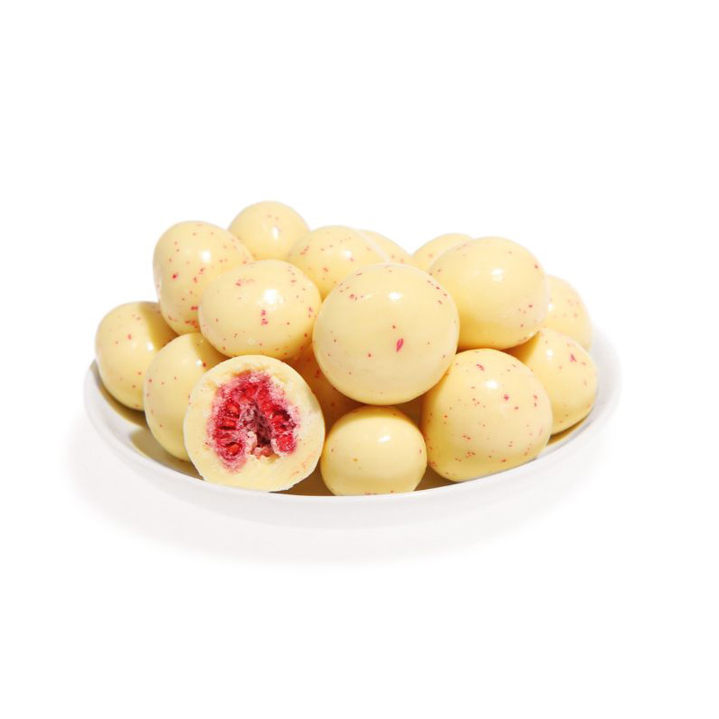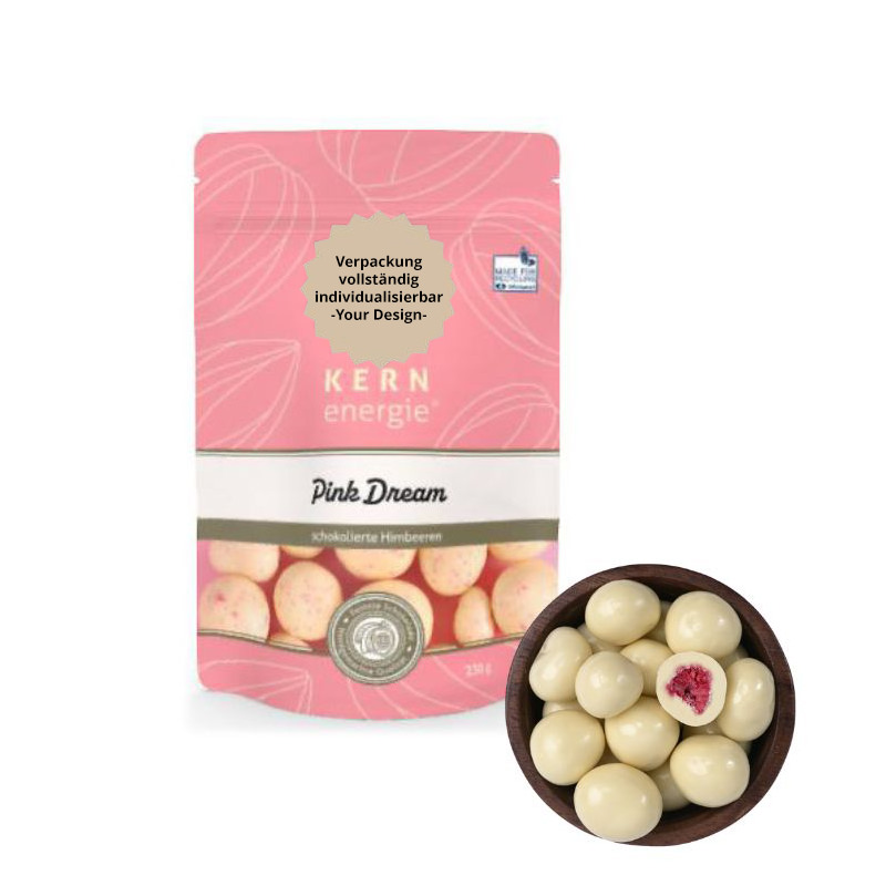 230 g gefriergetrocknete Himbeeren in Schokolade "Pink Dream" im Standbodenbeutel mit großer Werbeflächeab 10,35 € | ab 30 Arb.-Tg. | ab 500 Stk.