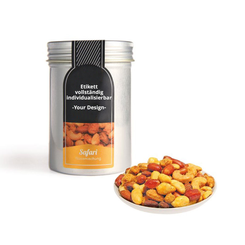 90 g Nussmischung "Safari" in der Aludose mit Frontetikettab 3,45 € | ab 5 Arb.-Tg. | ab 50 Stk.