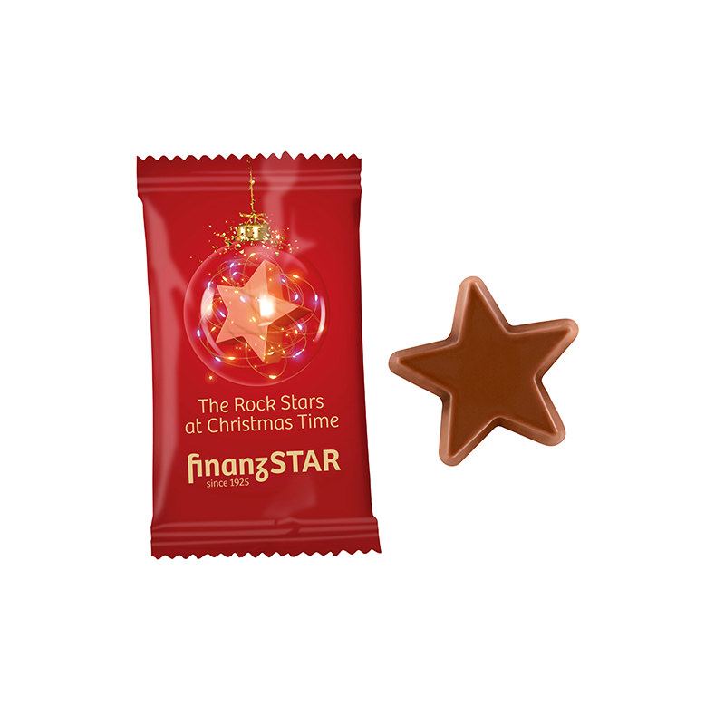 Schokostern im Flowpack mit Werbedruckab 0,20 € | ab 15 Arb.-Tg. | ab 5.000 Stk.